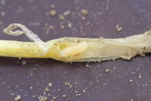 - Presencia de larvas : Pequeños gusanos blancos cerca de la base de las plantas de judía afectadas. Estas larvas son un claro indicador de infestación por la mosca de la semilla de la judía.